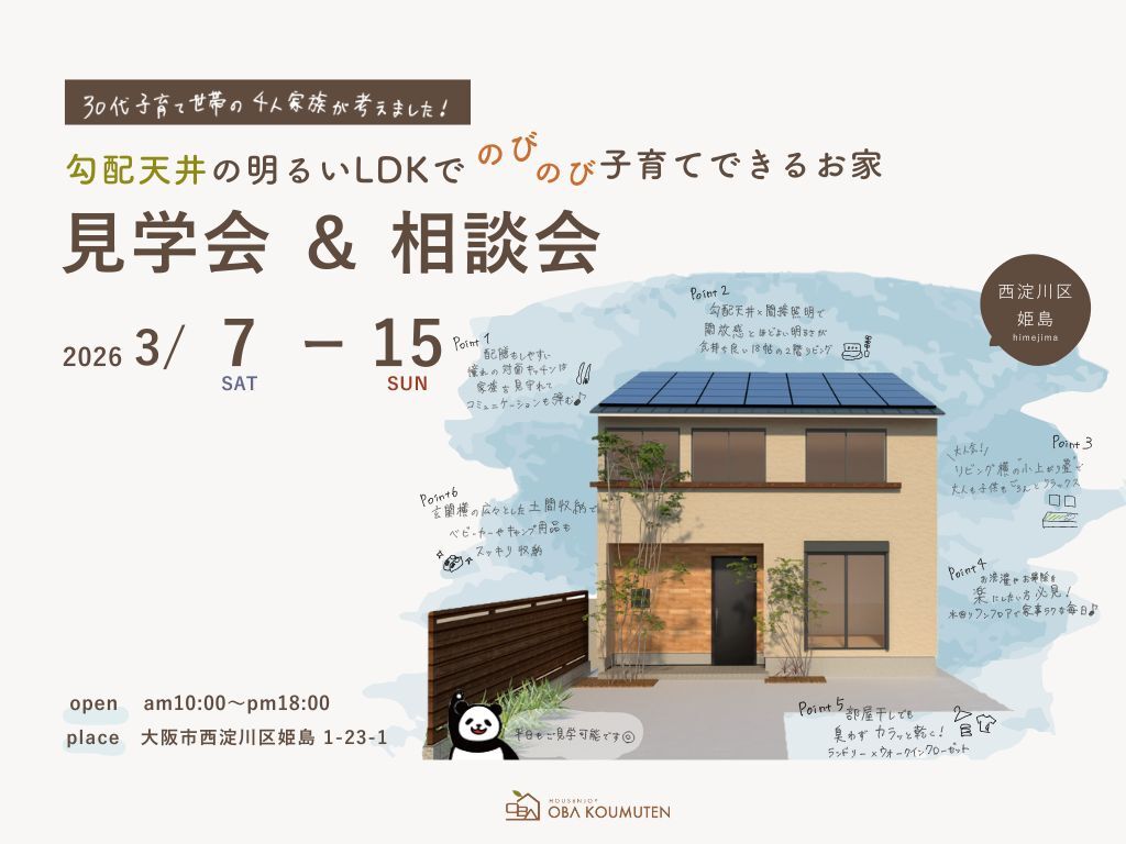 | タイトル | 《西淀川区姫島》30代子育て世帯が考えた 勾配天井の明るいLDKで のびのび子育てできるお家 見学会 |