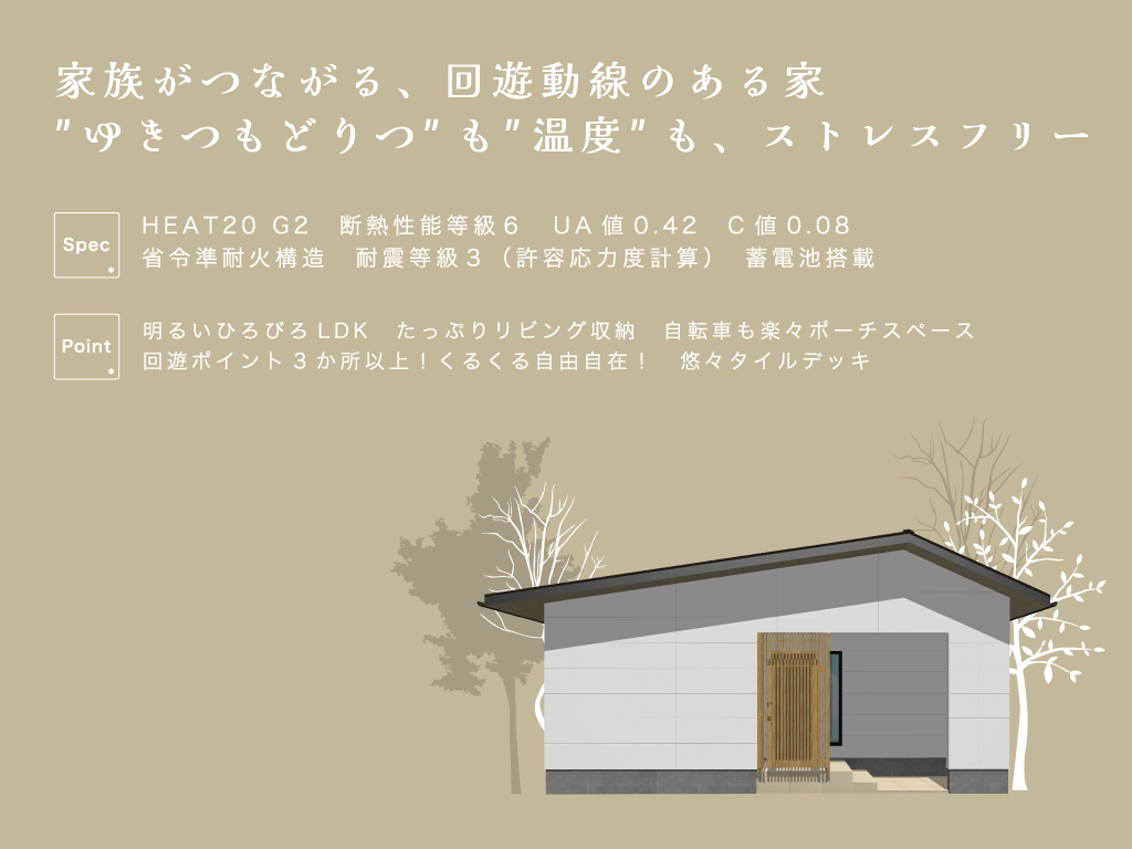 この住まいは高気密・高断熱設計で、一年を通じて快適な室内環境を保てます。さらに、エコ性能にも配慮しており、省エネで家計にも優しい家づくりを実現しています。