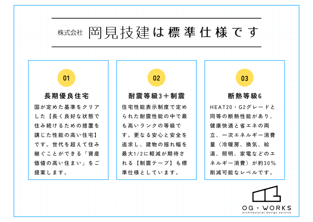 また、素材の特性が気密性を高めることにも繋がると考え、岡見技建では建物の性能をより向上させるため【制震テープ】も標準仕様としています。