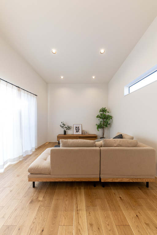 勾配天井のLDKと吹き抜け&高窓のある廊下