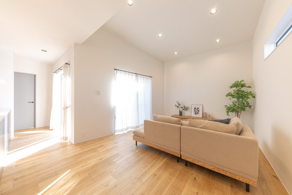 勾配天井が生み出す開放感あふれるLDKは、家族が自然と集まる心地よい空間に。