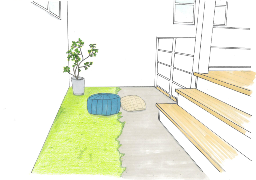 ●玄関土間の横には畳コーナー。急な来客でもこのスペースで対応できます。すのこが渡り廊下のような役目で、リビングから畳コーナーにゴロンと寛ぎに行ける♪