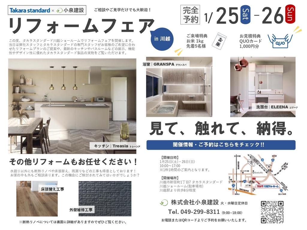 この度、小泉建設ではタカラスタンダード川越ショールームにてリフォームフェアを開催いたします。