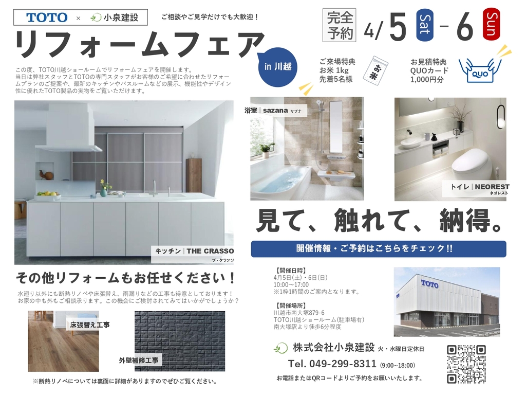 この度、小泉建設ではTOTO川越ショールームにてリフォームフェアを開催いたします。