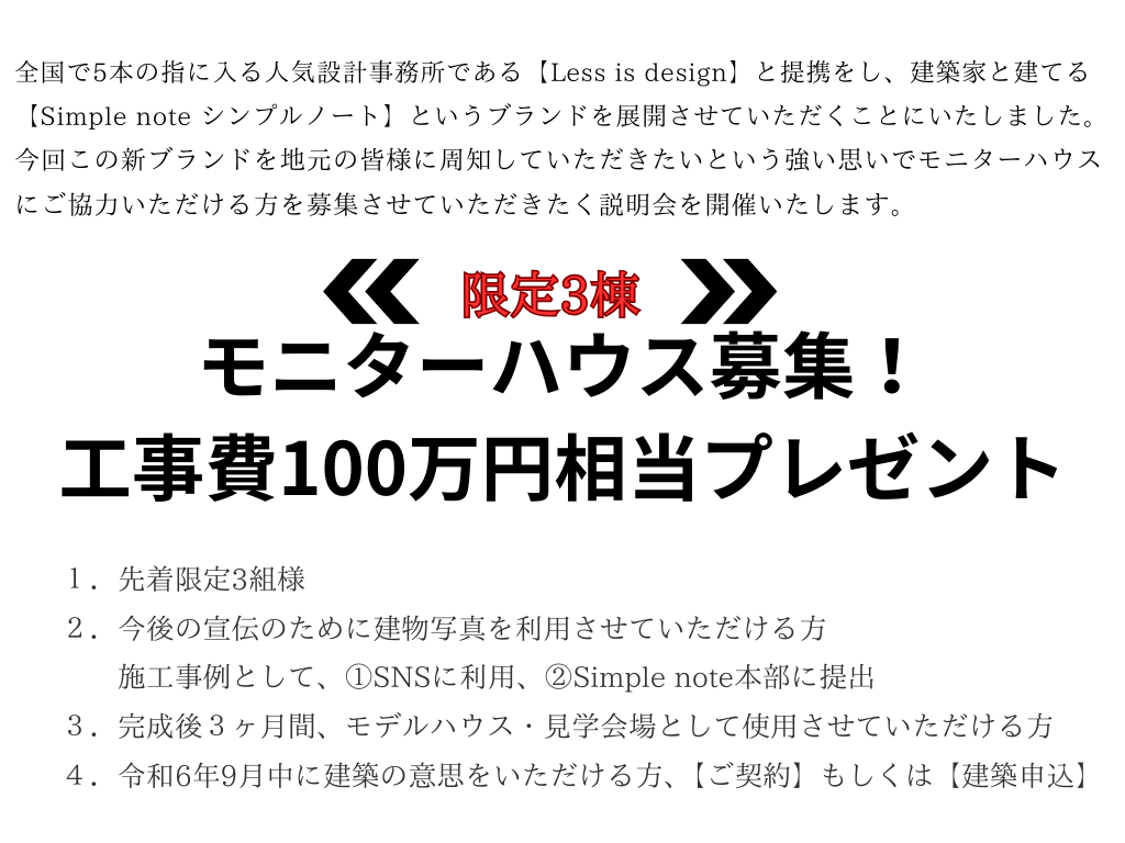 今回この新ブランドを地元の皆様に周知していただきたいという強い思いでモニターハウスにご協力いただける方を募集させていただきたく説明会を開催いたします。