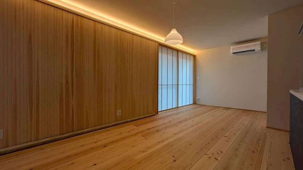 内壁にはオガファーザーを使用していますが、一部分にアクセントとして「木」を貼っています。