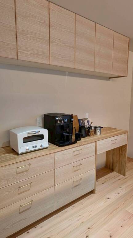 カップボード、洗面化粧台には既製品を使用せず、オリジナルの造作家具を設置しています。