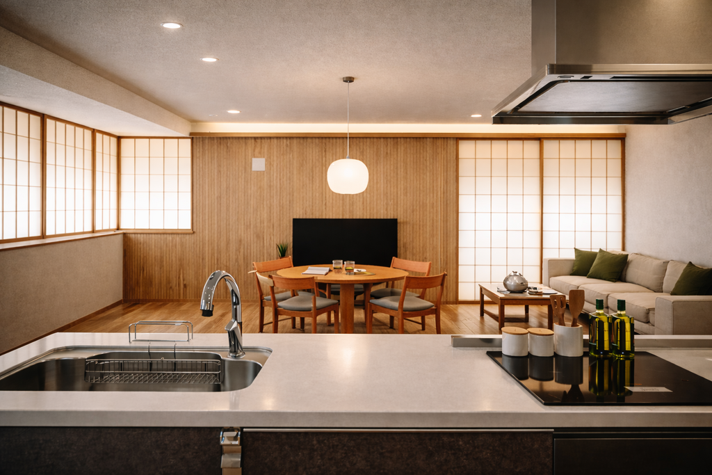家族が自然と集まる、ゆとりのあるリビング空間。視線の抜けを意識した設計で、実際の広さ以上に開放感を感じられます。