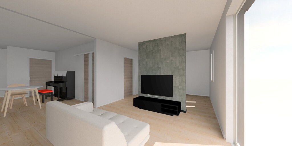 敷地形状を踏まえ、駐車スペースと開口部が重なる条件の中でも、リビングを勾配天井とし、高い位置から自然光を取り込む工夫が施されました。