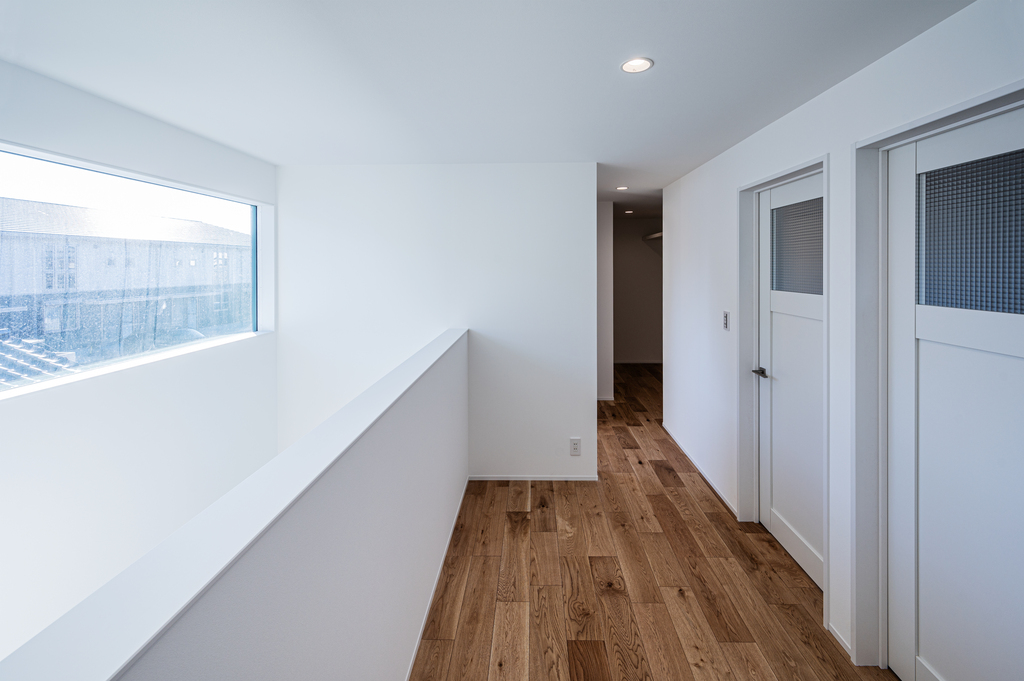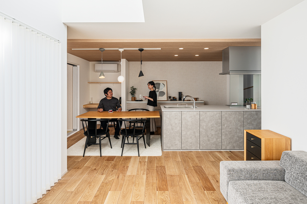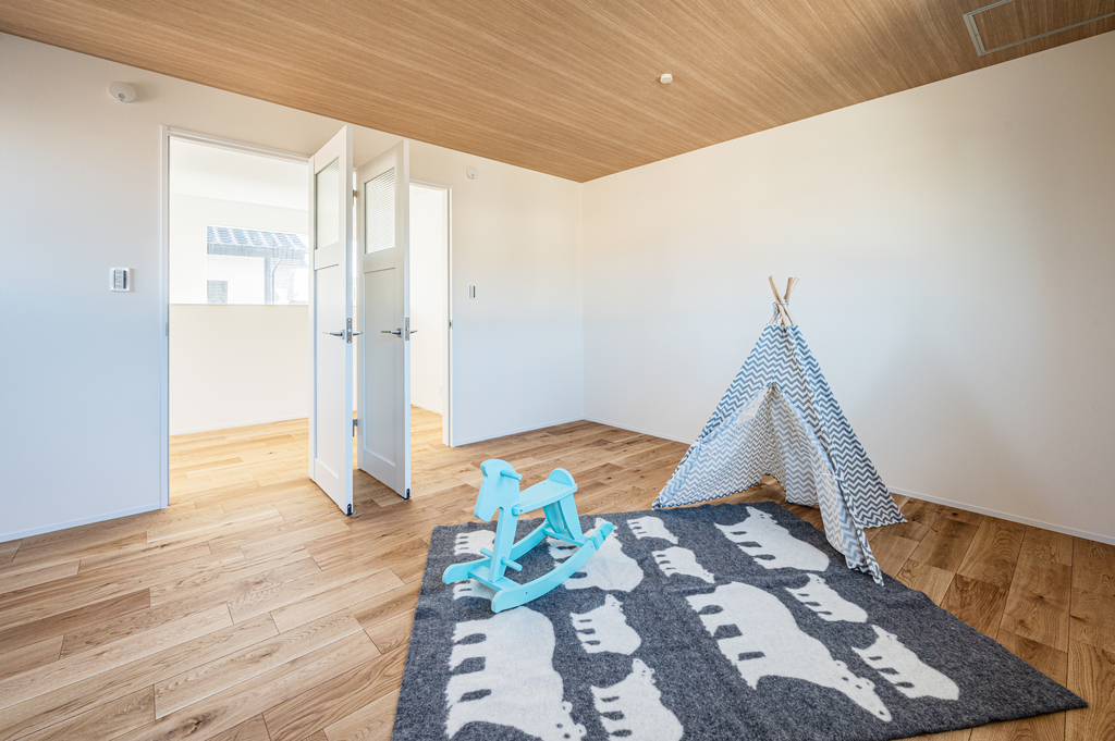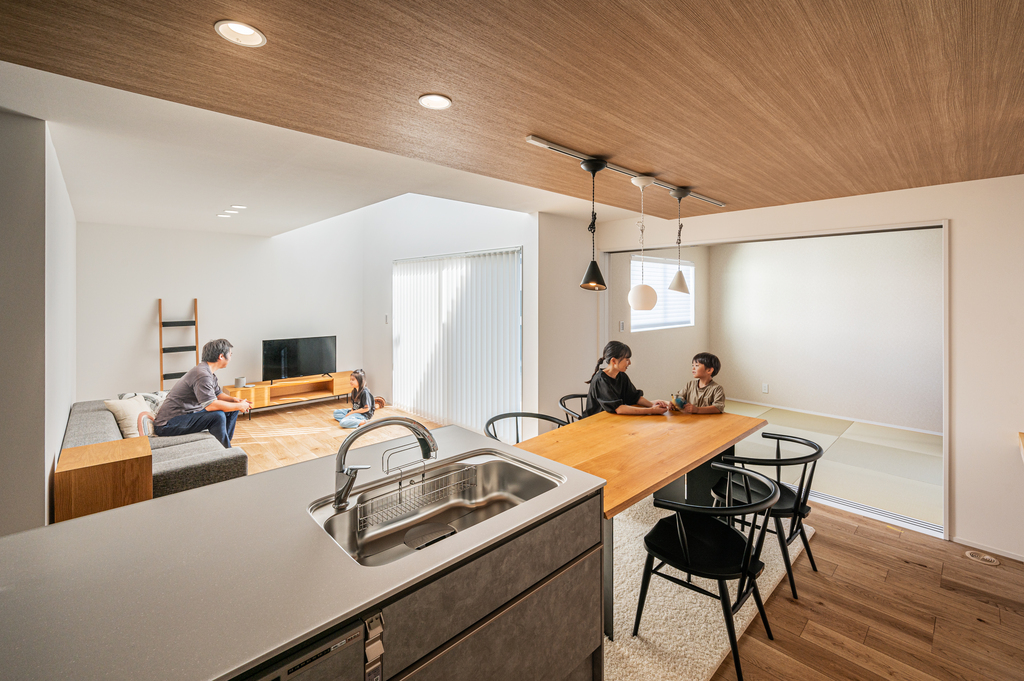 1階に和室を設けて普段は子どもが遊んだりのんびりくつろいだりしながら、親御さんが泊りに来た時には建具で空間を仕切れるようにしてある32坪(3LDK+和室+WIC)の2階建てとなっています。
