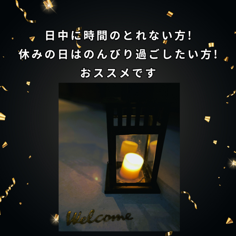 ドリンクのサービスもご用意しておりますので、リラックスしたひとときをお過ごしいただけます。日中に時間の取れない方にも、休みの日はのんびり過ごしたい方にも大変おススメです。