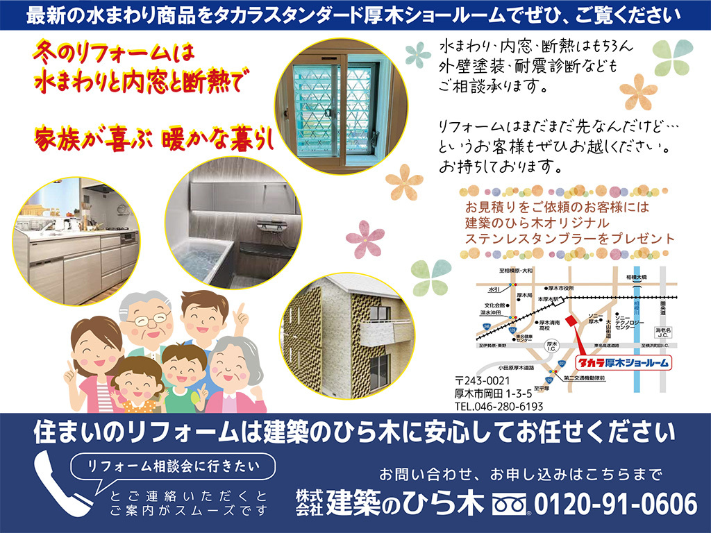 また、水まわりだけでなく、外壁塗装や内窓、断熱リフォームなど、住宅に関することなら何でもご相談いただけます。この機会にぜひお越しください!