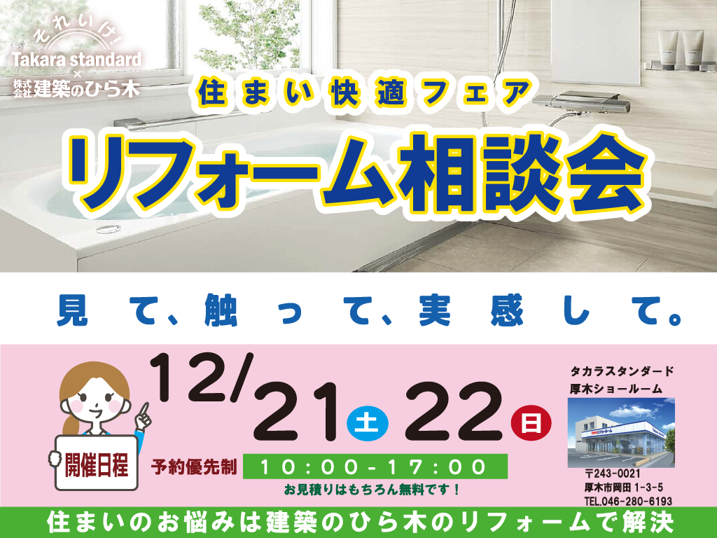 理想の住まいを手に入れるチャンスです!12月に開催されるリフォーム相談会では、水まわりだけでなく、皆さまの家の悩みや希望を専門のスタッフがじっくりとお伺いします。この機会を利用して、住まいをもっと快適に、もっと素敵に変えてみませんか?