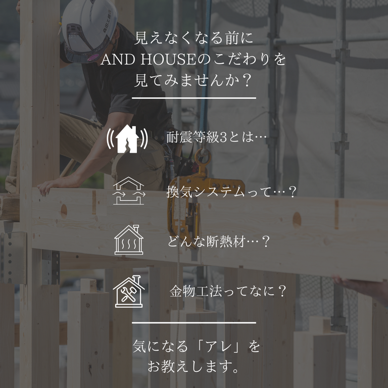 建てた後ではもう見ることのできない構造について、リアルにご確認いただけます。建築中の現場にて、細部にわたるこだわりをご覧ください。