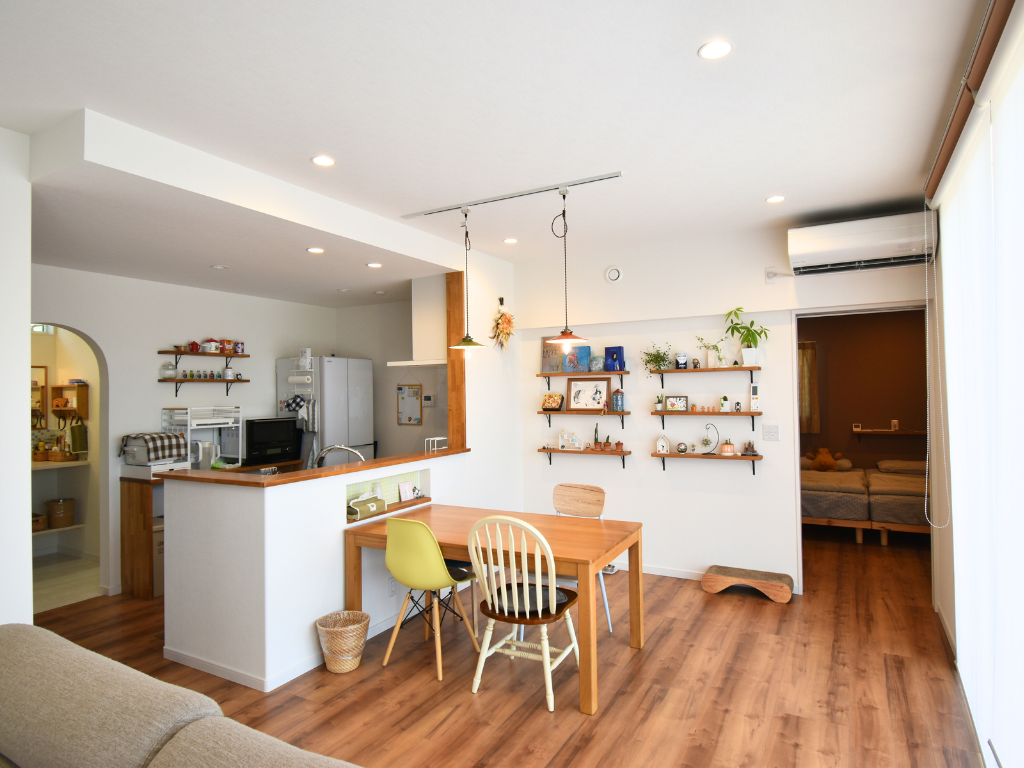 ネコちゃんと快適に過ごせる広々リビング。平屋の魅力を最大限に引き出した、ワンフロアの開放感と広がりを実感してください。