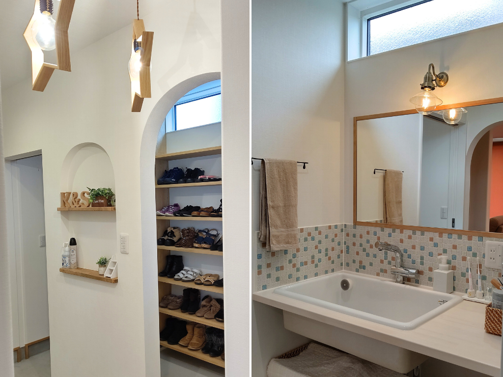 洗面スペースやシューズクロークにはおしゃれなアーチ型開口部を採用。可愛いタイルをあしらった造作洗面台が毎日を楽しく彩ります。細部にまでこだわったデザインをぜひ見に来てくださいね。