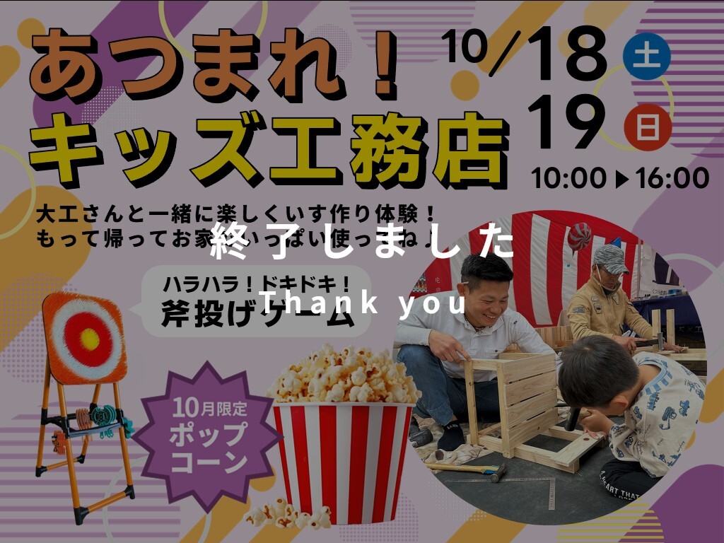 お子さまがプロの大工さんと一緒にものづくりを体験できるほか、斧投げゲームやお菓子付き風船プレゼントなど、家族全員が笑顔になれるイベントが盛りだくさんです♪