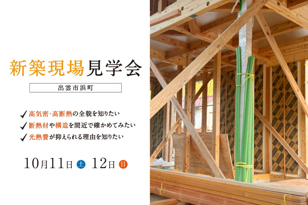 出雲市浜町で『見る・知る・解る構造見学会』の開催をいたします。実際の建築現場で、今しか見ることができない断熱材や構造材を知っていただく建築途中の構造見学会です。