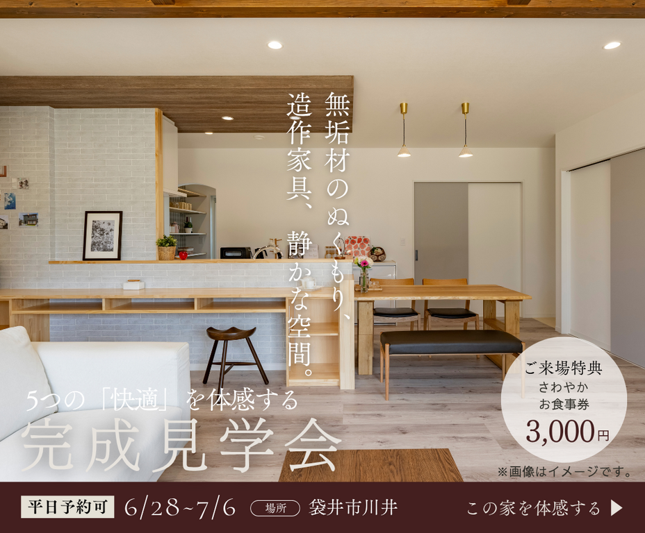 6月28日(土)~7月6日(日)の9日間、お客様のご厚意で開く完成見学会は、「間取り」「性能」「素材感」── 体感しなければ気づけない本物の家づくりの魅力を、5つのポイントでご案内します。本当に住み心地のいい家を体感し、ぜひ将来のマイホームに思いを馳せてみてください!