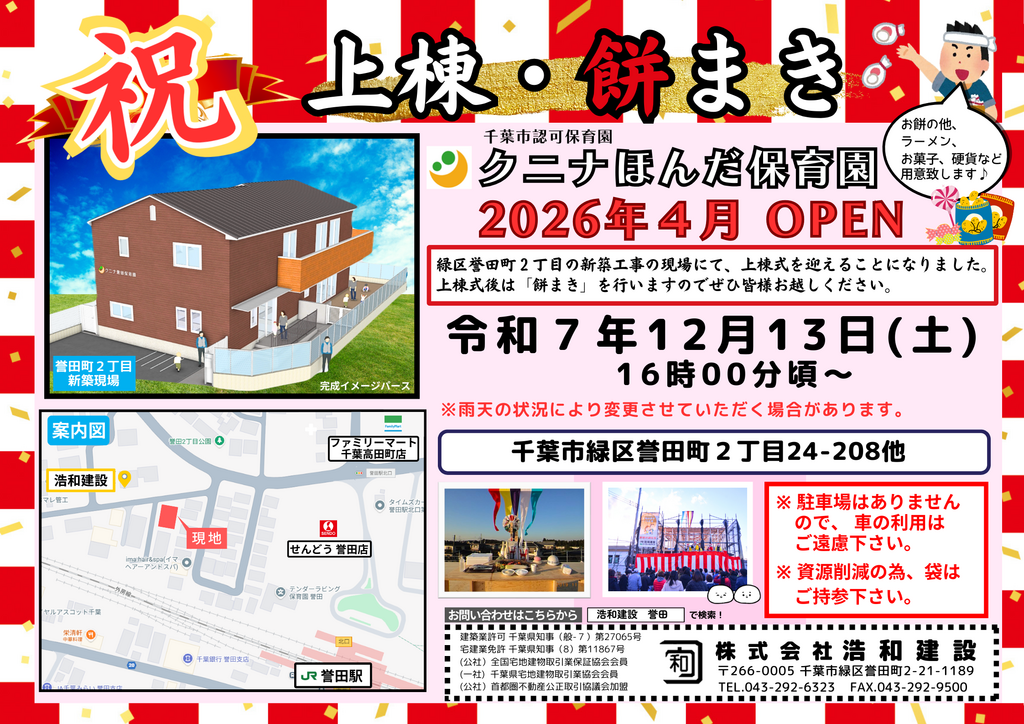 | タイトル | 【千葉市緑区誉田町】 クニナほんだ保育園 上棟&餅まき開催! |