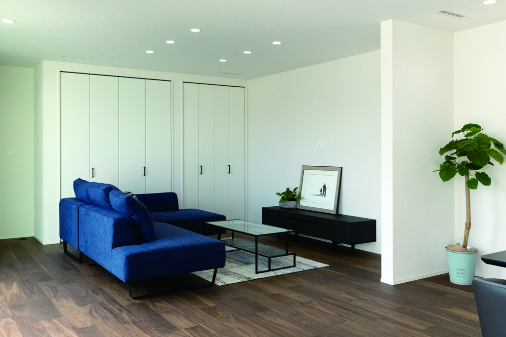家族みんなが快適に過ごせる広々とした、リビングダイニング。自然に会話が生まれる間取り、空間をご提供いたします。リビングには壁一面に収納を設けました。