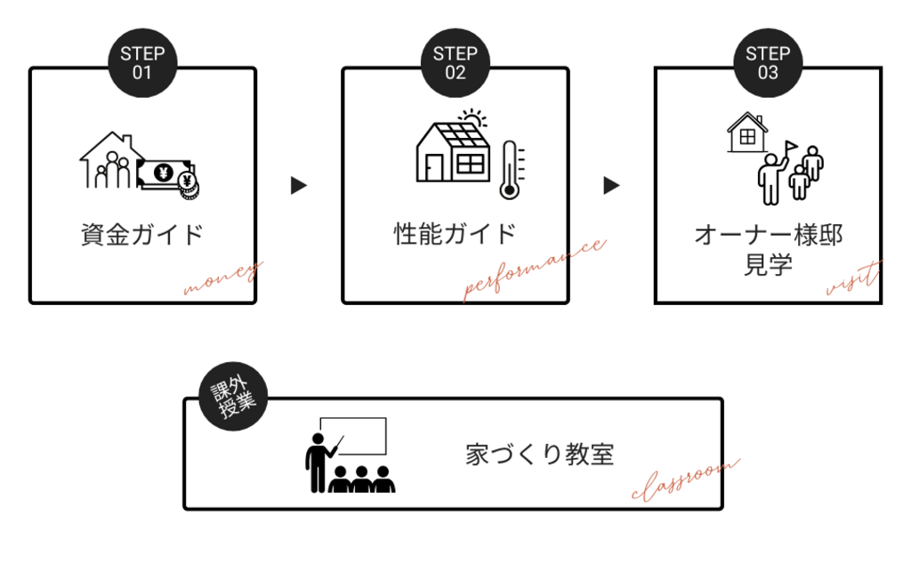 「資金ガイド」「性能ガイド」「オーナー様邸見学」の3つのステップを順を追って進めることで、理想の住まいを実現するための知識と準備を整えましょう。