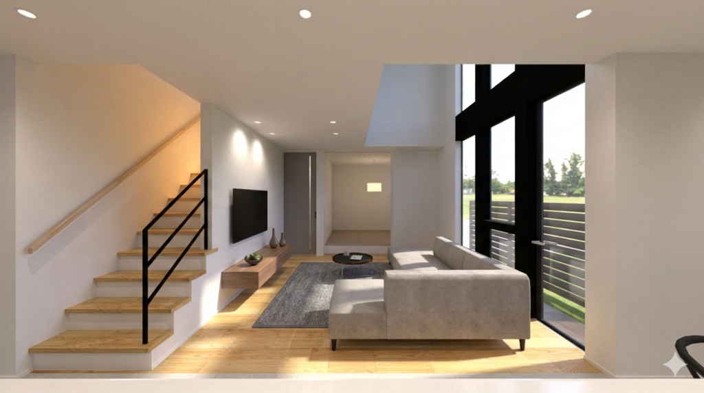 連なった窓が目を惹く開放的なリビング。吹抜けから光がたっぷりと注ぎます。キッチンからはリビングやテラス・和室まで見渡せて、家族の様子が分かるので安心。リビング階段で家族が自然と会話する間取り設計。