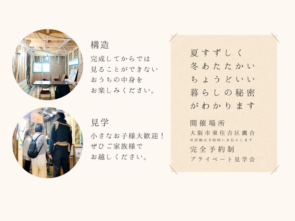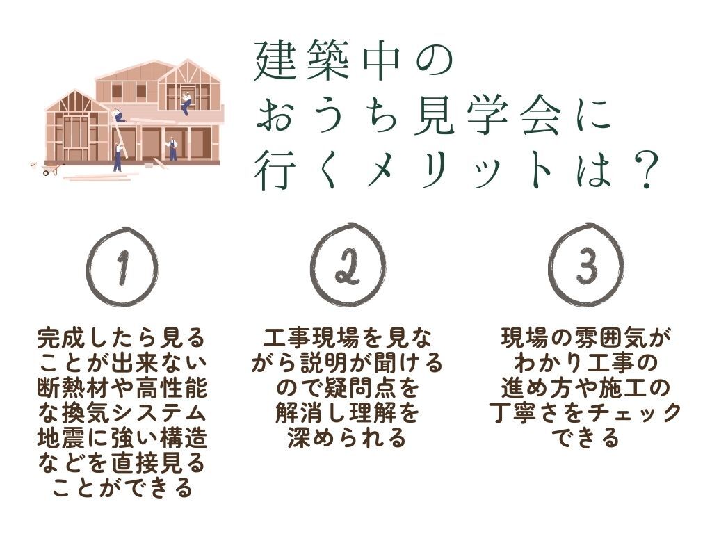 『建築中のおうち見学会』では、建築中のおうちに入って基礎や構造、壁や屋根、床の中など完成してからでは、確認できないところをチェックすることができます。耐震性・断熱性といった普段見られない部分も見られ、家の構造の秘密を知ることができます。