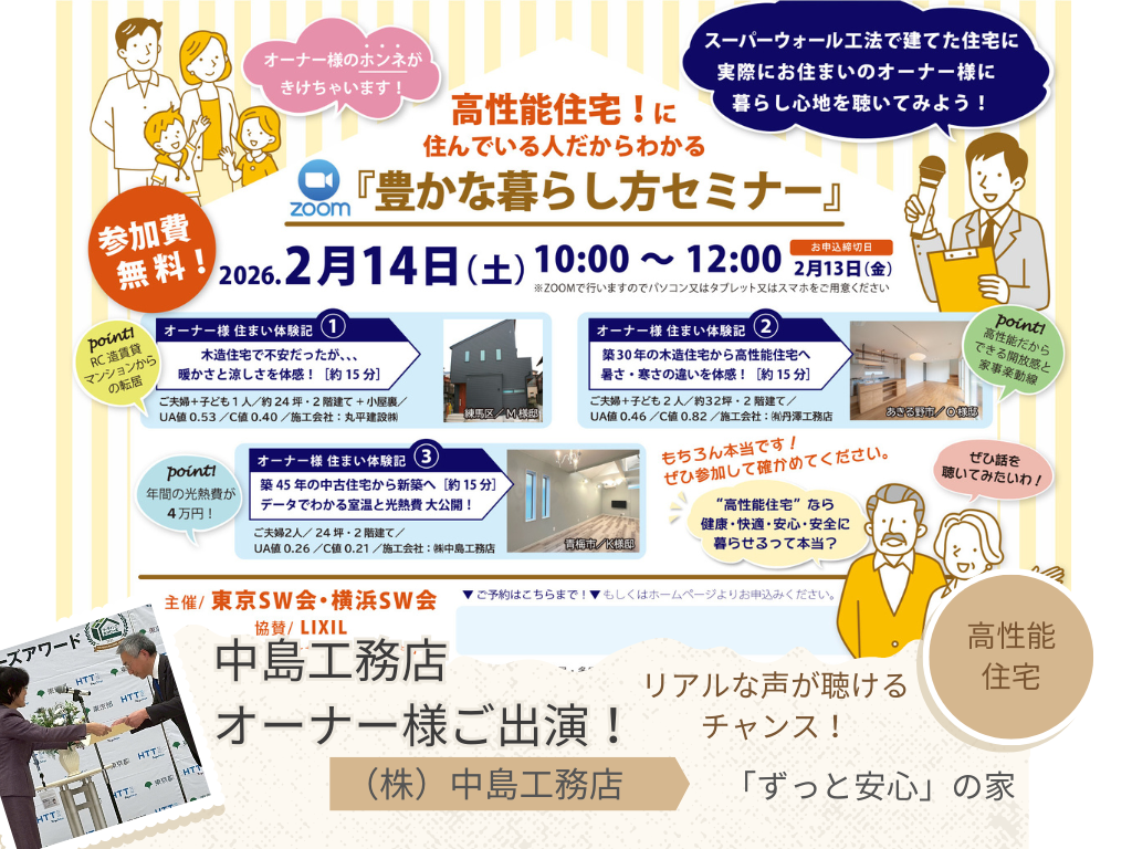 このセミナーでは、SW工法の高性能住宅に実際に住んでいらっしゃるオーナー様のリアルな声を聴くことができます。