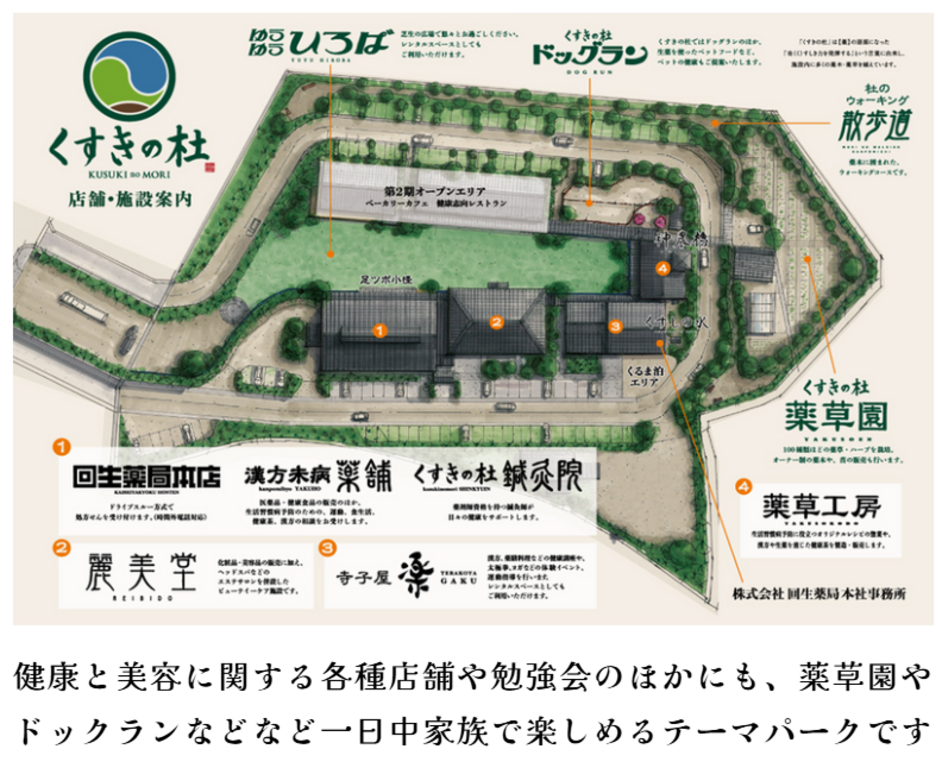 くすきの杜は健康と美容に関する各種店舗や勉強会のほかにも、薬草園やドックランなどなど一日中家族で楽しめるテーマパークです。