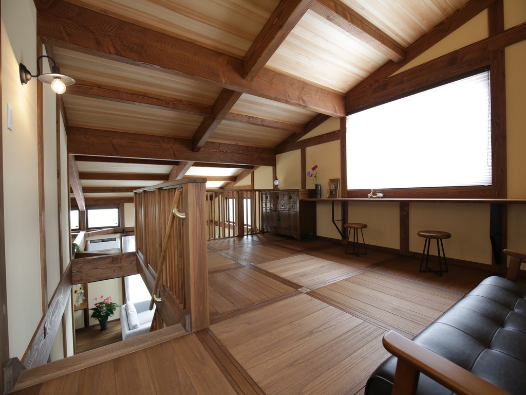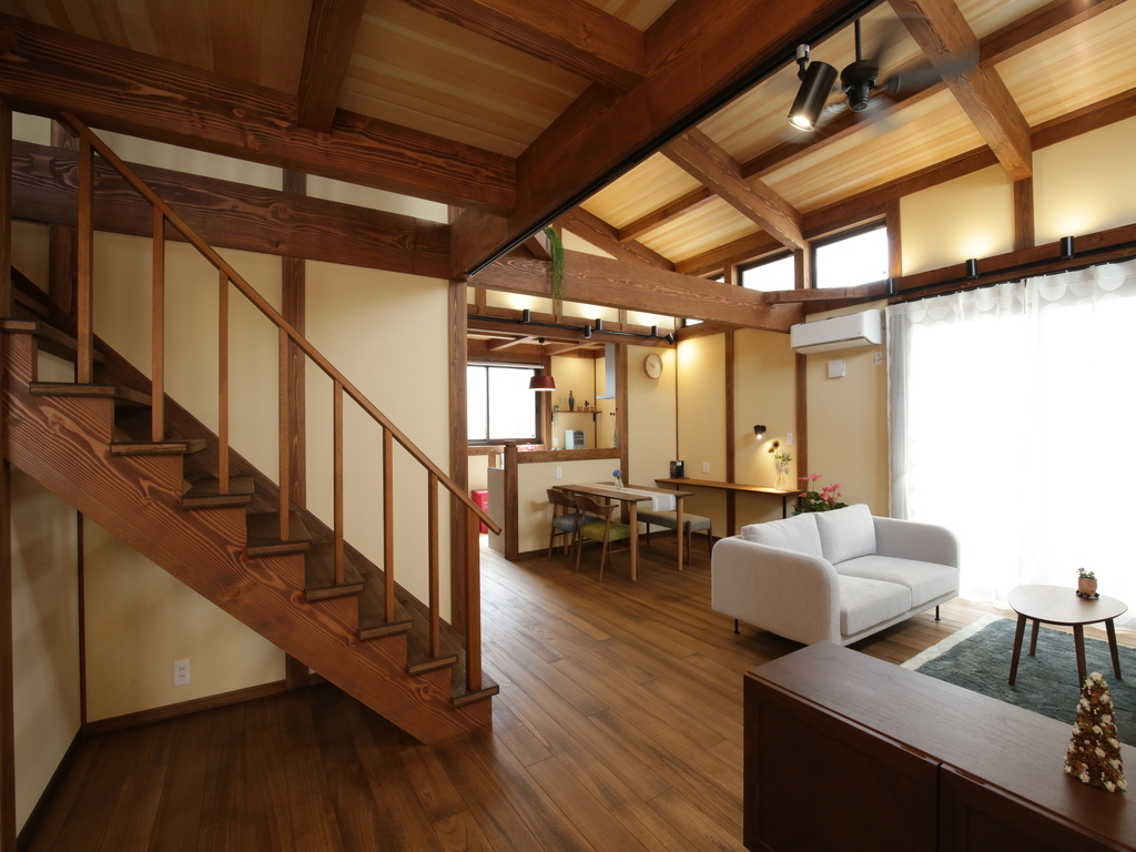 四寸の柱や梁が現しになっており、無垢材の存在感を十分に味わうことができます。デザインだけでなく、機能性も充実しているため、安心してご利用いただけます。 -