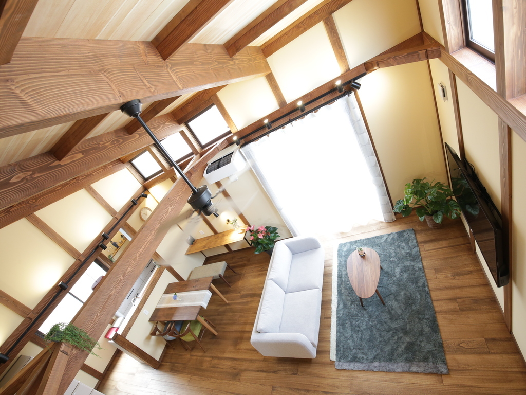 上から見下ろすことで、天井の高さと開放感がより一層伝わります。小さな空間でも広く感じることができ、構造材としての梁がデザインの一部としてインテリアに映えています。ナチュラルな木目が空間に温かさを与えています。