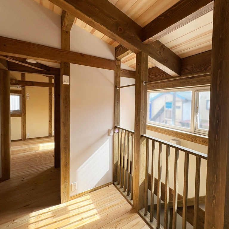● 柱が表しになった、真壁構造屋根なりにかかる登り張りの美しい内観
