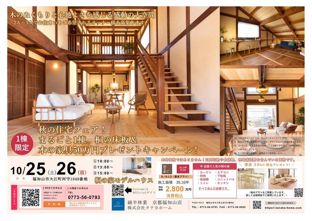 秋の住宅フェア!まるごと1棟。桐の床板&木の家具50万円プレゼントキャンペーン!