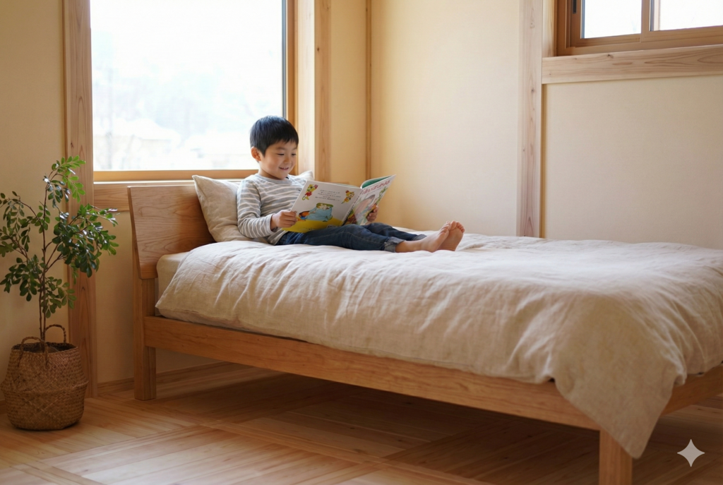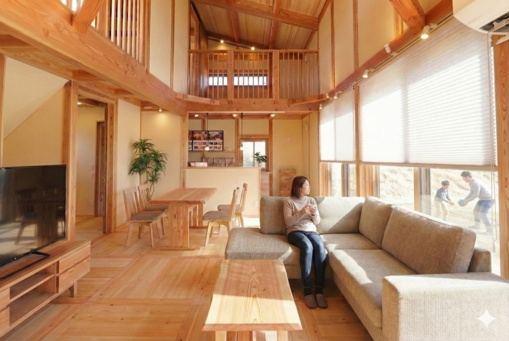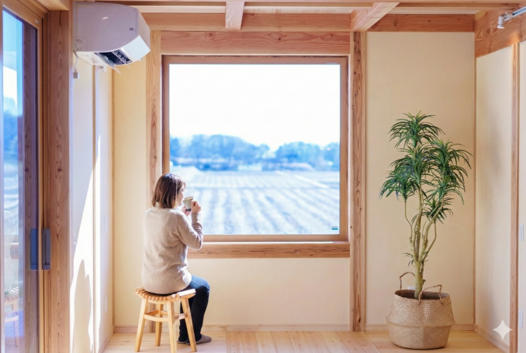 ✔ 無垢の赤松フローリング 足触りが柔らかく、冬でもヒヤッとしない温かさ。 裸足で過ごしたくなる心地よさを、ぜひ現地で確かめてください。