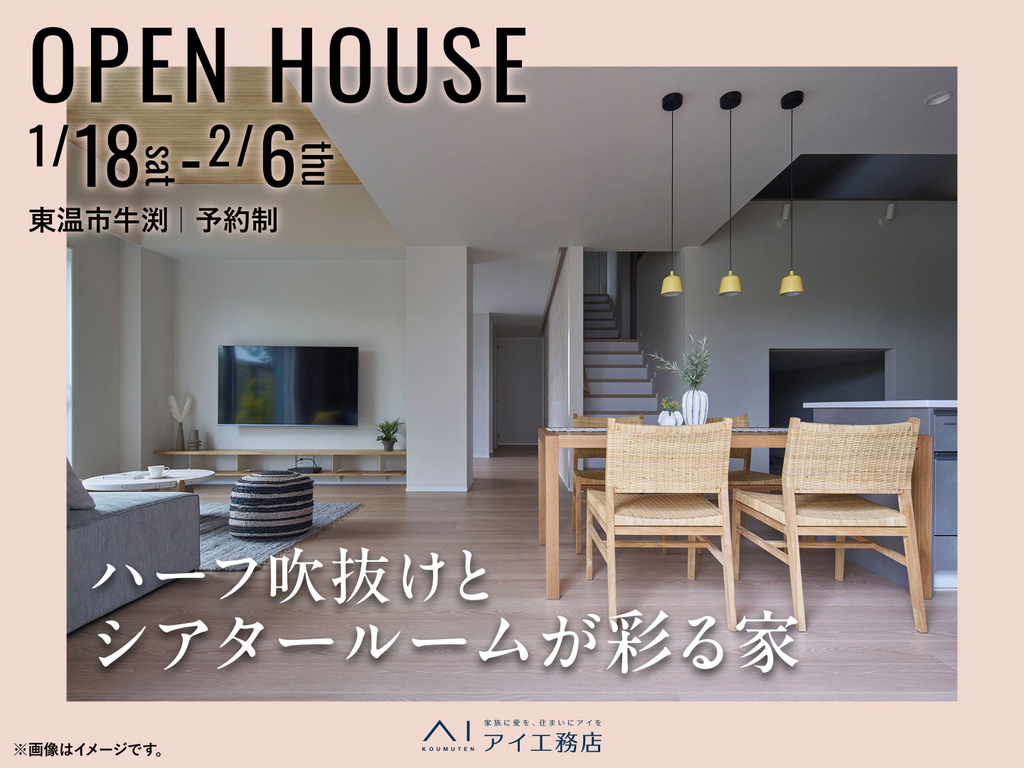 | タイトル | 松山展示場 《東温市牛渕》ハーフ吹抜けとシアタールームが彩る家 完成見学会 |