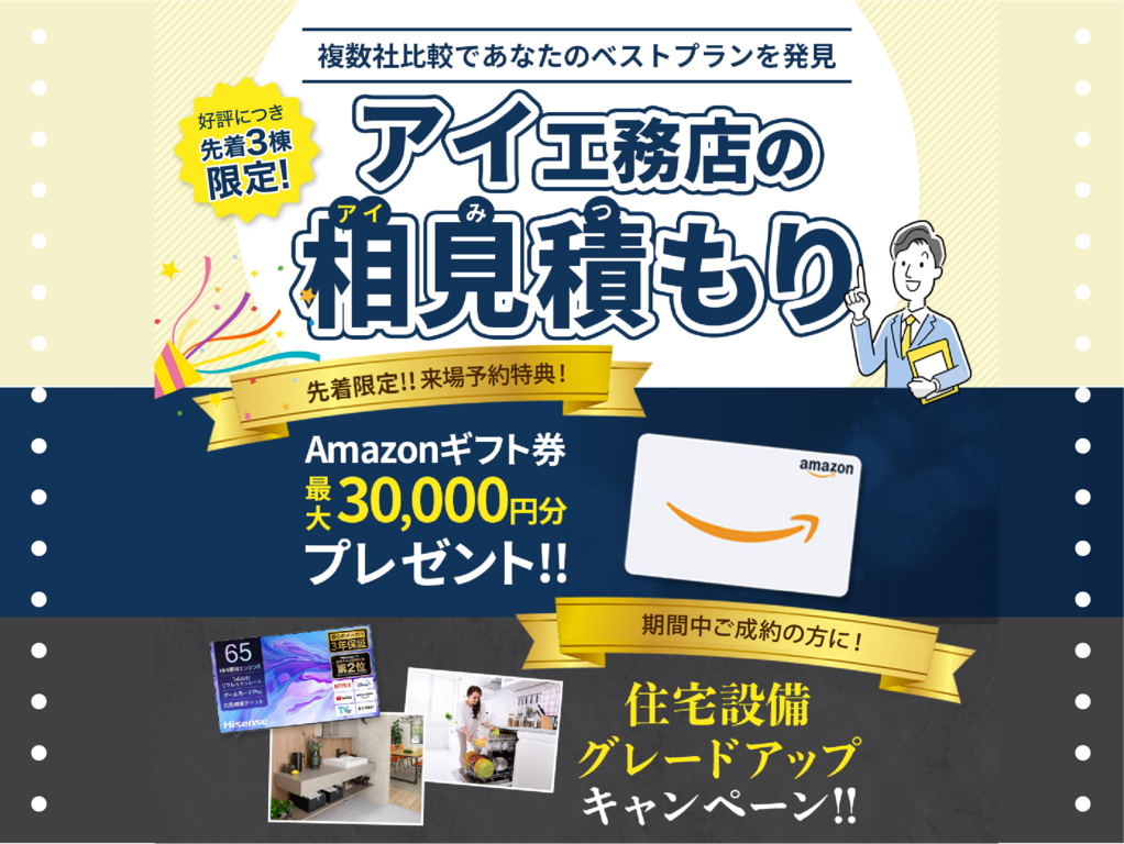 本キャンペーンは株式会社アイ工務店による提供です。本キャンペーンについてのお問い合わせはAmazonではお受けしておりません。アイ工務店各展示場までおねがいいたします。