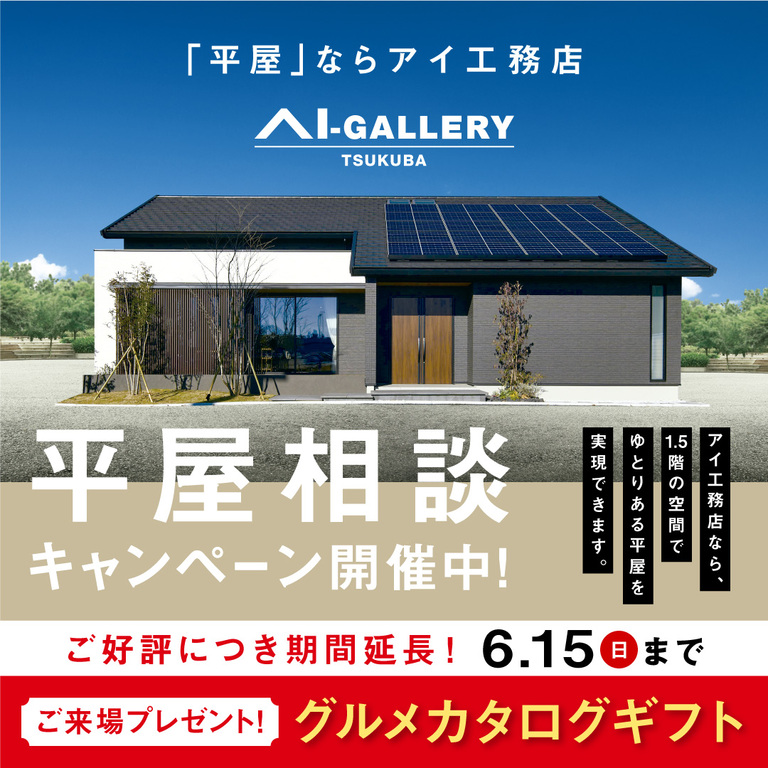 | タイトル | アイギャラリーつくば(ショールーム併設型住宅展示場)平屋相談キャンペーン期間延長 |