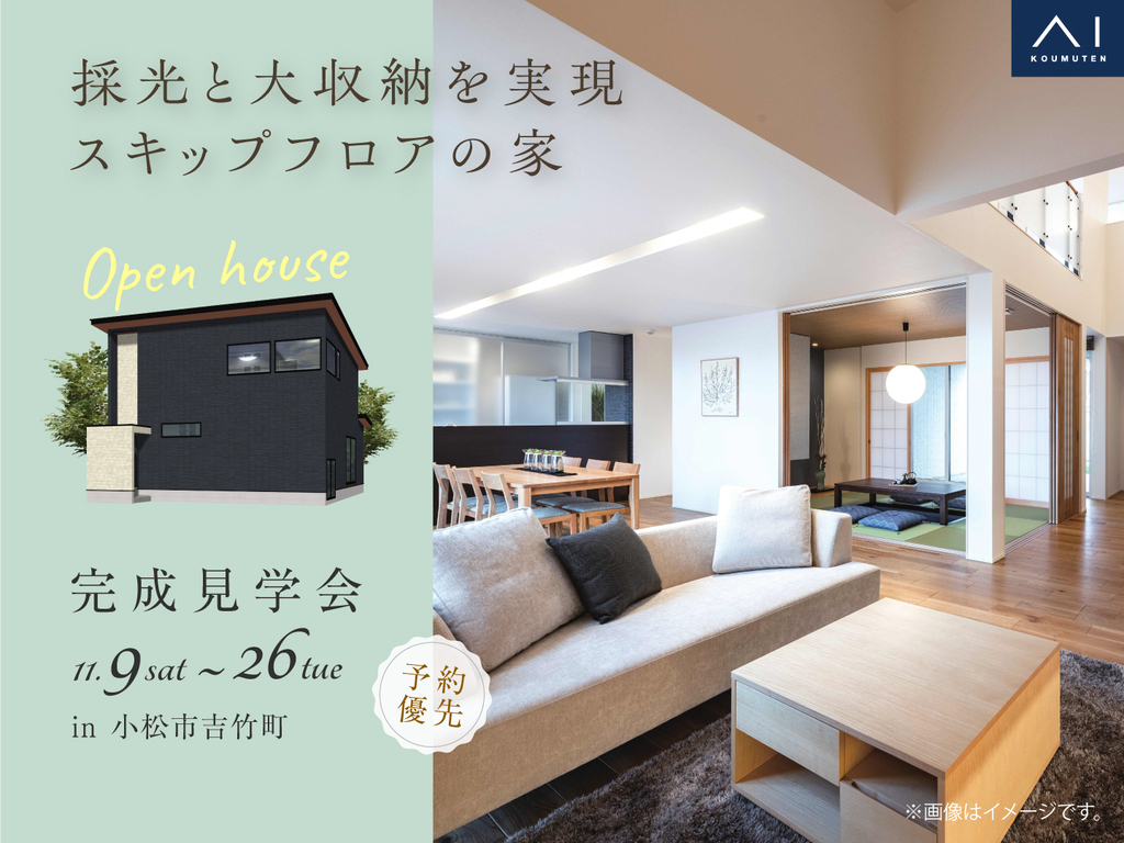 | タイトル | アイパーク金沢 《小松市吉竹町》採光と大収納を実現 スキップフロアの家 完成見学会 |
