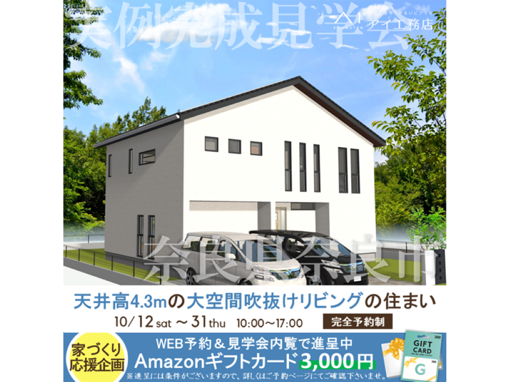 Amazonギフトカードの進呈につきましては、アイ工務店へのご来場が初めてで、これから住まいづくりをご検討されているお客様に限らせて頂きますので、予めご了承下さいますようお願いを申し上げます。