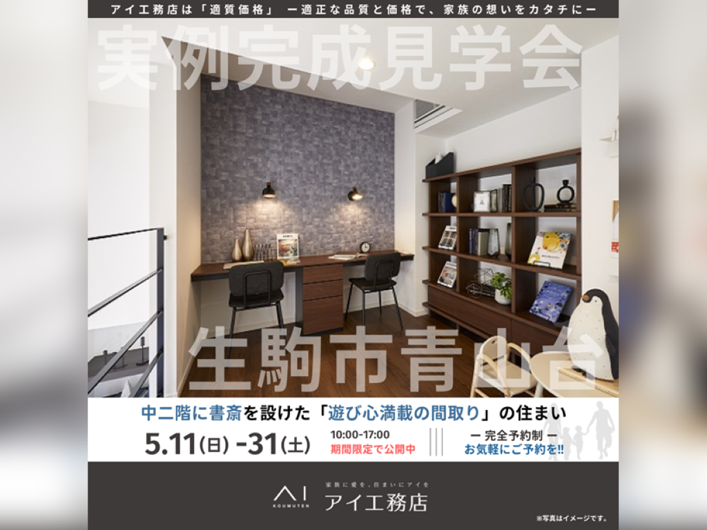 生駒市青山台にアイ工務店の新築注文住宅【中二階に書斎を設けた「遊び心満載の間取り」の住まい】が完成しました。