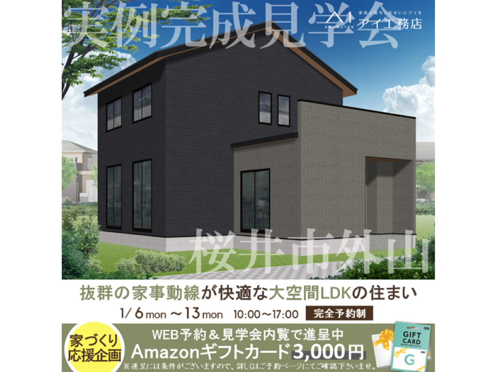 Amazonギフトカードの進呈につきましては、アイ工務店へのご来場が初めてのお客様に限らせて頂きますので、予めご了承下さいますようお願いを申し上げます。