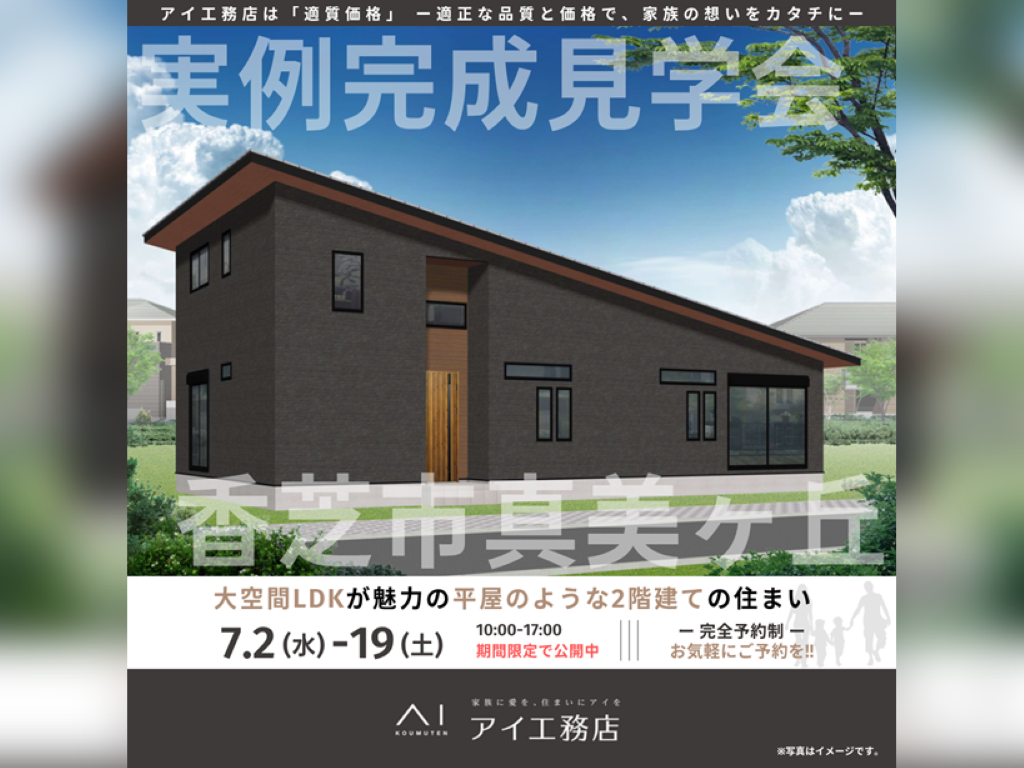奈良県香芝市真美ヶ丘にアイ工務店の新築注文住宅【大空間LDKが魅力の平屋のような2階建ての住まい】が完成しました。