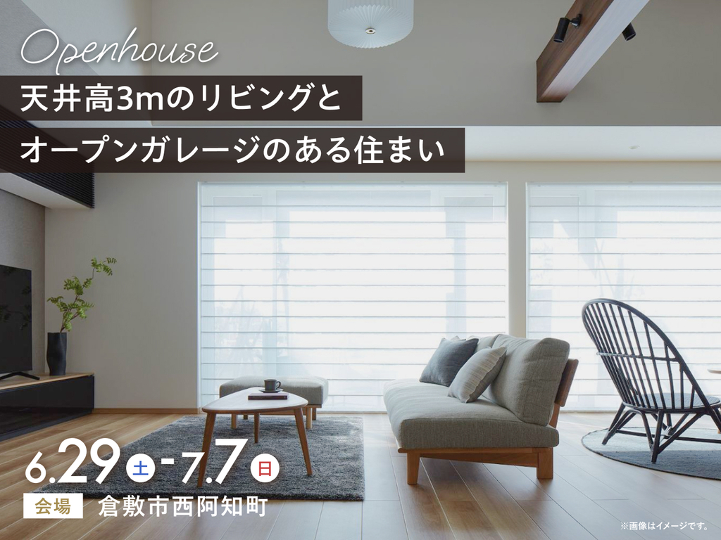 | タイトル | 岡山RSK展示場 《倉敷市西阿知町》天井高3mのリビングとオープンガレージのある住まい 完成見学会 |