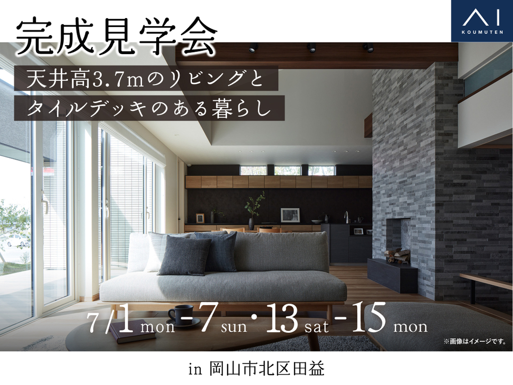 | タイトル | 岡山第二展示場 《岡山市北区田益》天井高3.7mのリビングとタイルデッキのある暮らし 完成見学会 |