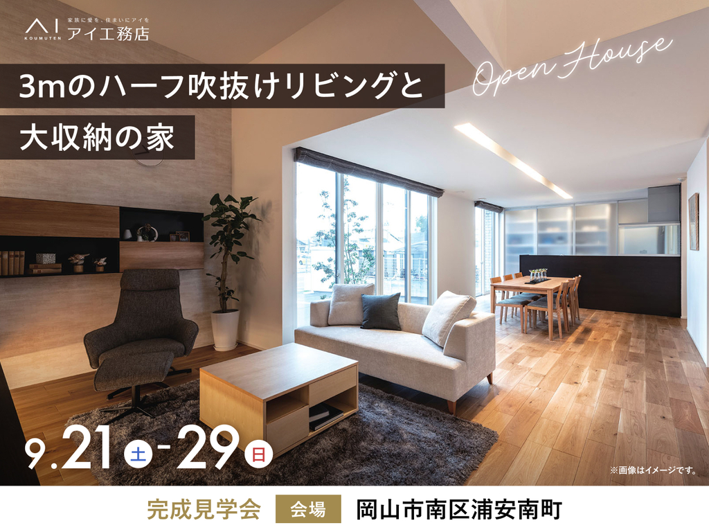 | タイトル | 岡山第二展示場 《岡山市南区浦安南町》3mのハーフ吹抜けリビングと大収納の家 完成見学会 |