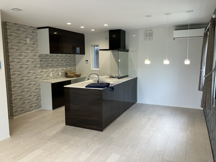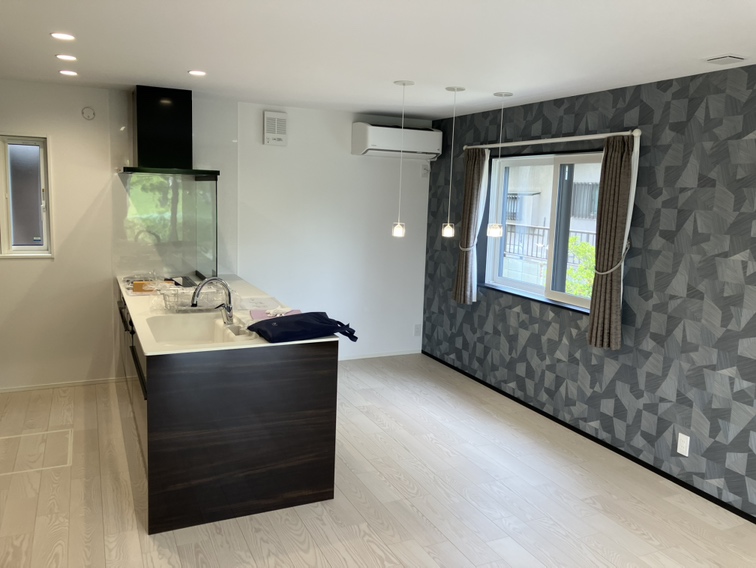 直線状に配置されたLDKの一端に位置するキッチンは空間を一望できる対面式。