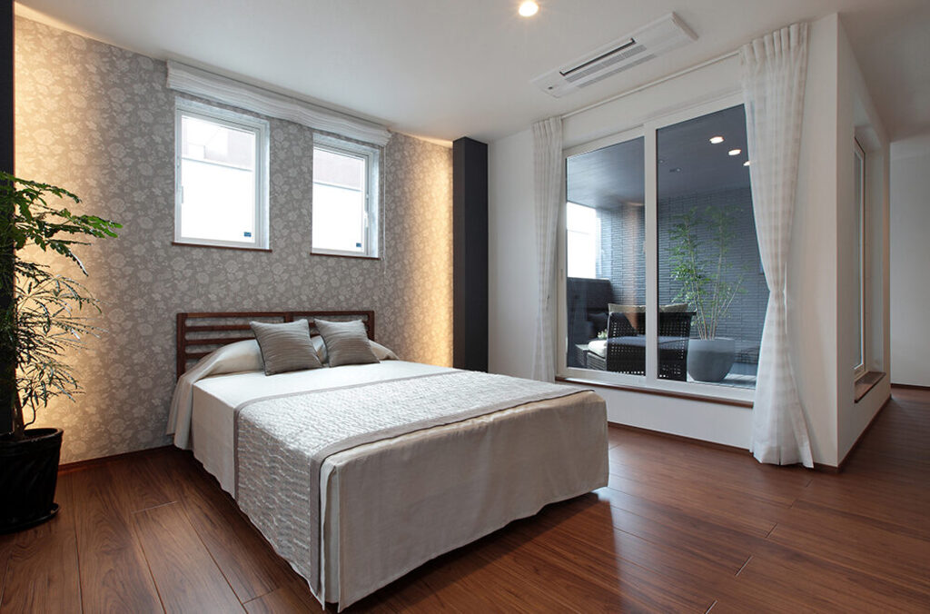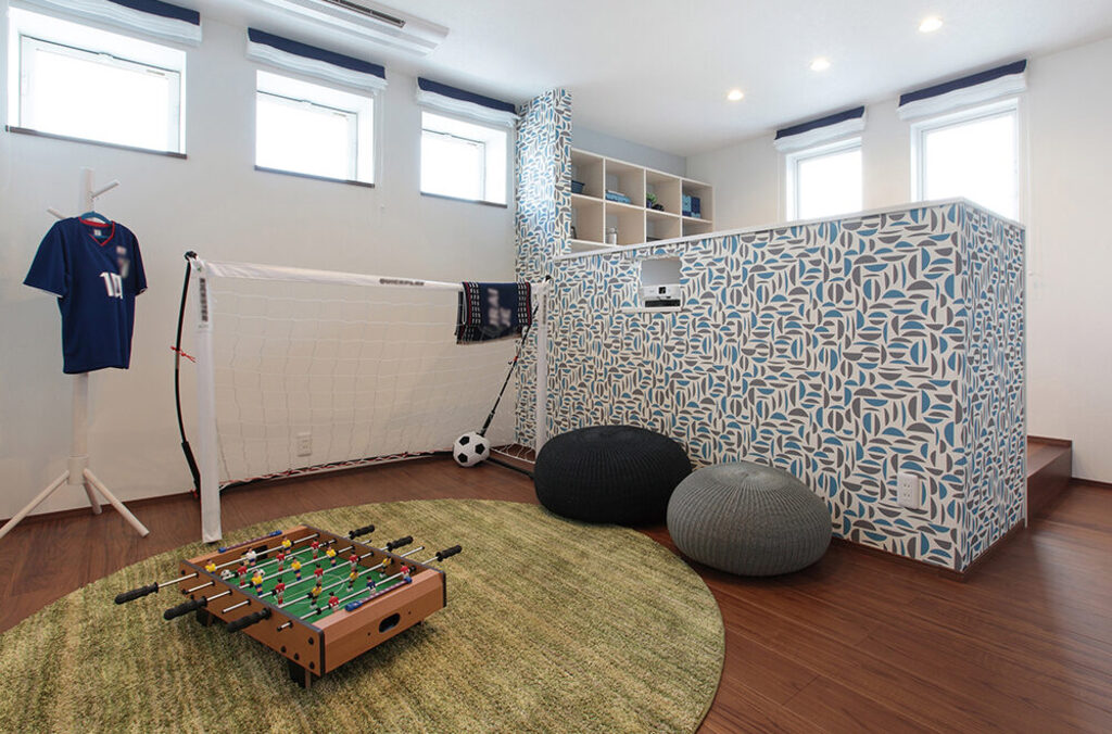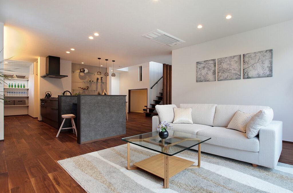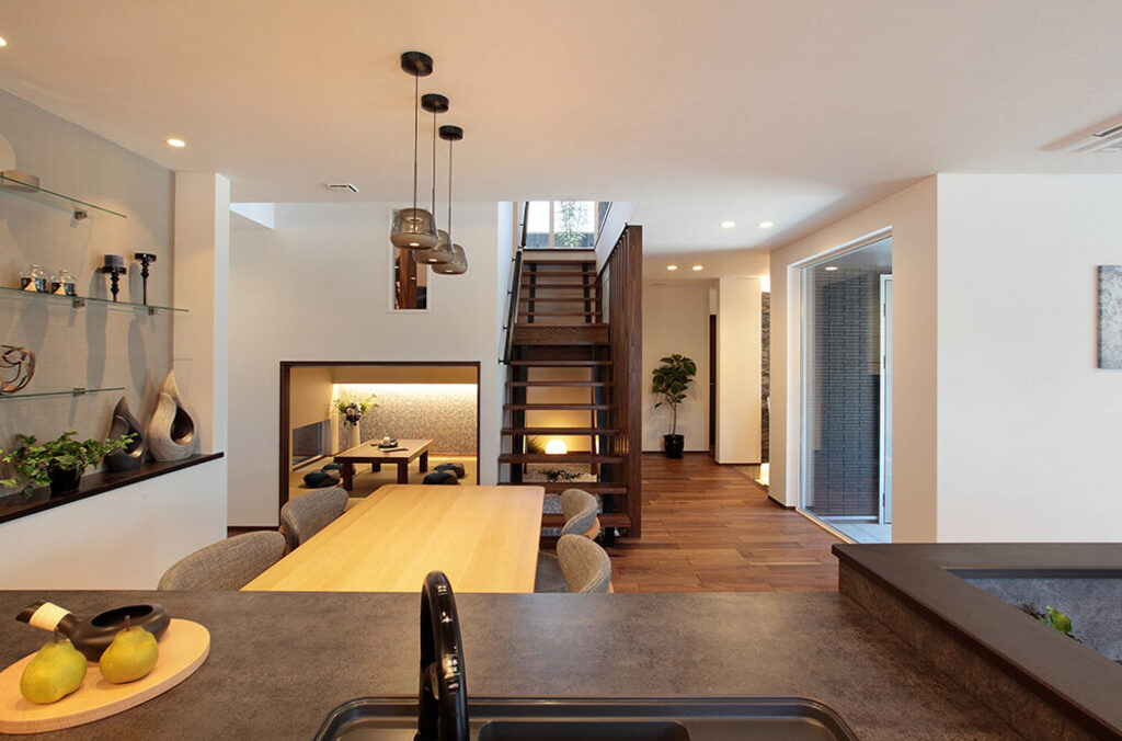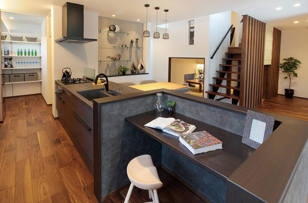 栃木県内3棟目、CRTハウジング足利50号会場にある「足利展示場」は、落ち着いた色合いが印象的な和モダンテイスト。壁面に大谷石を用いた玄関や、リビング階段の下を利用した玄関ホールの坪庭も、和の風情を漂わせています。どこにいても家族の気配を感じられる1階は、キッチン横のママ書斎や、畳敷きにした天井高1.4mの和室が見どころ。キッチンを中心にしたレイアウトは、どこにいても家族の気配を感じられます。バーラウンジ仕立ての1.5階や、キッズスペースにもなる2階のスキップ収納、スタディーコーナーとロフトを設けた子ども部屋など、空間提案も充実しています。
