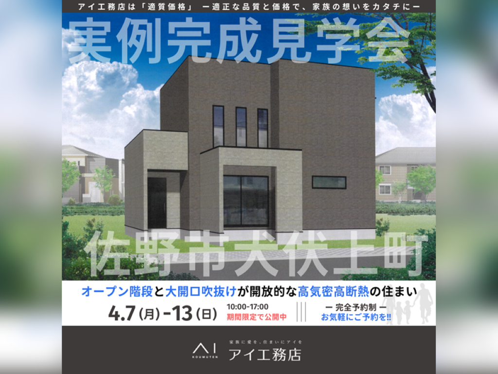 栃木県佐野市犬伏上町にアイ工務店の新築注文住宅【オープン階段と大開口吹抜けが開放的な高気密高断熱の住まい】が完成しました。