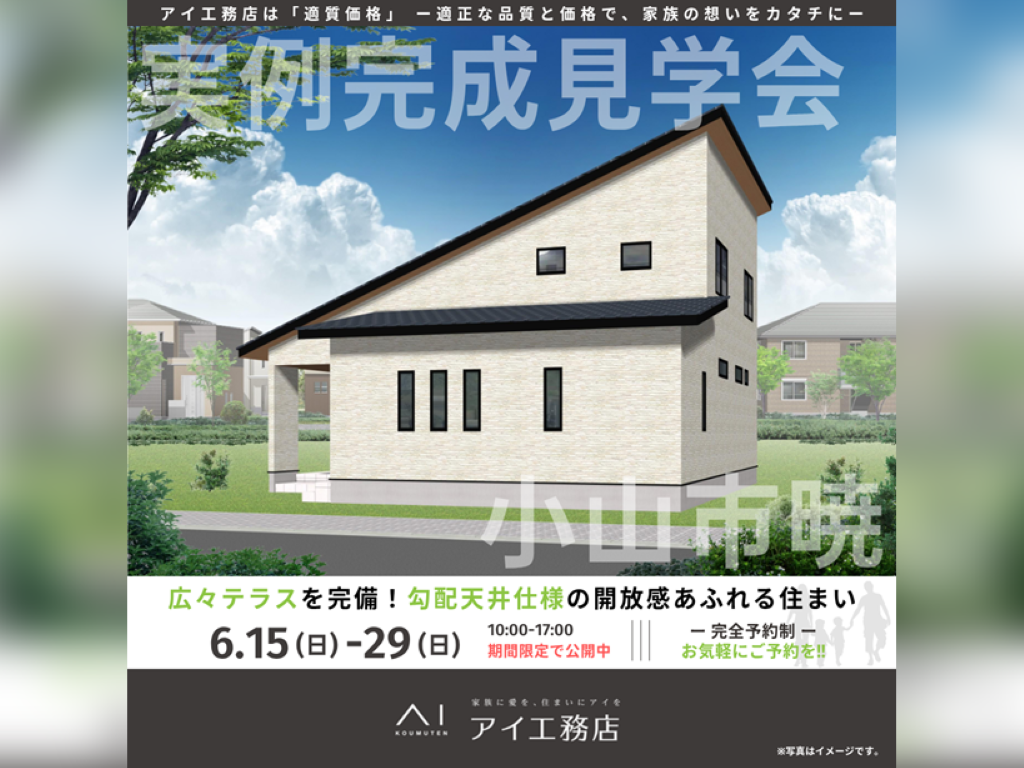 栃木県小山市暁にアイ工務店の新築注文住宅【広々テラスを完備!勾配天井仕様の開放感あふれる住まい】が完成しました。